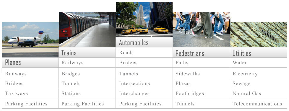 The field of transportation can be divided into three major market sectors: (1) infrastructure, (2) vehicles, and (3) operations. UNICORN’s sector is the first of these – infrastructure. Within that sector, we service 5 vertical markets, including: